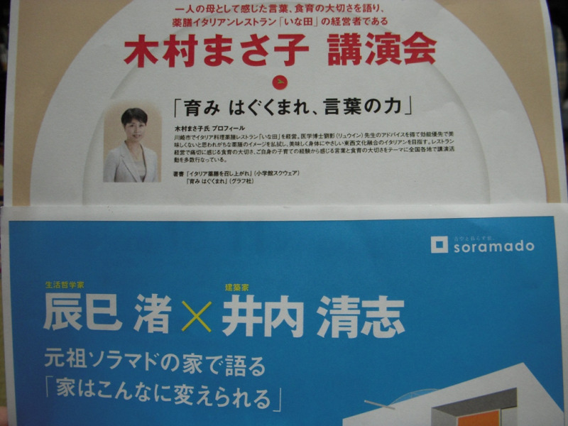 明日は、生活哲学者の辰巳渚さんと、建築家の井内清志さんの講演会。