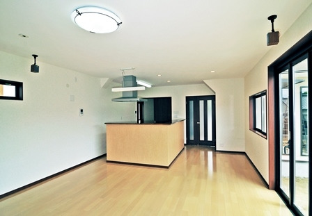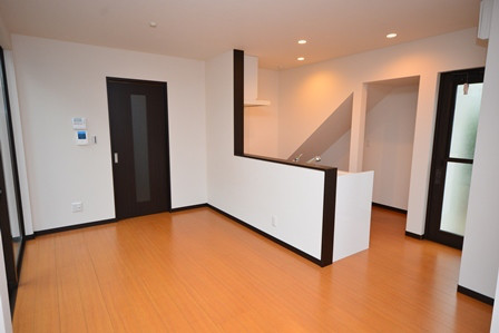 ダークブラウンの建具・巾木・サッシの内観色でコントラストを演出。