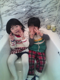 久山町・H様邸のお子さんたちが浴槽のサイズを体感中