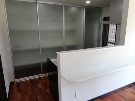 キッチンの後ろの収納は、最近人気のアルミ製建具を使って目隠しに。