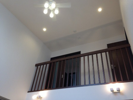 キャットウォークの手すりは木製にして、落ち着きを演出